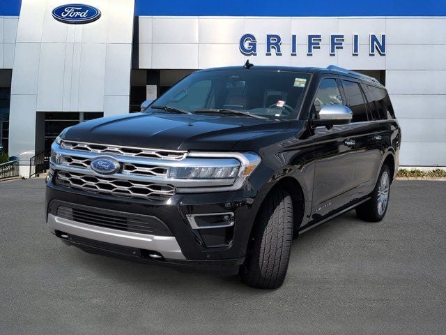 Griffin Ford Lincoln is pumped up to offer this good-looking 2023 Ford Expedition Max Platinum In Black Metallic. This vehicle is beautifully equipped with Equipment Group 600A Standard Package, Heavy-Duty Trailer Tow Package (26mm Engine Radiator, 3.73 Axle Ratio, 360-Degree Camera w/Trailer Reverse Guidance, Integrated Trailer Brake Controller, and Pro Trailer Backup Assist), 22 Speakers, 3rd row seats: split-bench, 4-Wheel Disc Brakes, ABS brakes, Active Park Assist 2.0 Removal, Adaptive suspension, Adjustable pedals, Air Conditioning, Alloy wheels, AM/FM radio: SiriusXM with 360L, Auto High-beam Headlights, Auto-dimming door mirrors, Auto-dimming Rear-View mirror, Automatic temperature control, Brake assist, Bumpers: body-color, Compass, Delay-off headlights, Driver door bin, Driver vanity mirror, Dual front impact airbags, Dual front side impact airbags, Electronic Stability Control, Emergency communication system: SYNC 4 911 Assist, Exterior Parking Camera Rear, Four wheel independent suspension, Front anti-roll bar, Front Bucket Seats, Front Center Armrest, Front dual zone A/C, Front fog lights, Front License Plate Bracket, Front reading lights, Fully automatic headlights, Garage door transmitter, Genuine wood console insert, Genuine wood dashboard insert, Genuine wood door panel insert, Hands-Free Foot-Activated Liftgate Removal (DISC), Heated door mirrors, Heated front seats, Heated rear seats, Heated steering wheel, Htd/Ventilated Prem Lthr Front Captain's Chairs (DISC), Illuminated entry, Leather steering wheel, Low tire pressure warning, Memory seat, Navigation system: Connected Navigation, Occupant sensing airbag, Outside temperature display, Overhead airbag, Overhead console, Panic alarm, Passenger door bin, Passenger vanity mirror, Pedal memory, Power door mirrors, Power driver seat, Power Liftgate, Power moonroof, Power passenger seat, Power steering, Power windows, Radio data system, Radio: B&O Unleashed Sound System by Bang & Olufsen, Rain sensing wipers, Rear air conditioning, Rear anti-roll bar, Rear audio controls, Rear reading lights, Rear window defroster, Rear window wiper, Reclining 3rd row seat, Remote keyless entry, Second Row Power Windows Removal, Security system, SiriusXM w/360L, Speed control, Speed-sensing steering, Speed-Sensitive Wipers, Split folding rear seat, Spoiler, Steering wheel memory, Steering wheel mounted audio controls, SYNC 4 w/Enhanced Voice Recognition, Tachometer, Telescoping steering wheel, Tilt steering wheel, Traction control, Trip computer, Turn signal indicator mirrors, Variably intermittent wipers, Ventilated front seats, Voltmeter, and Wheels: 22 12-Spoke Polished Aluminum!